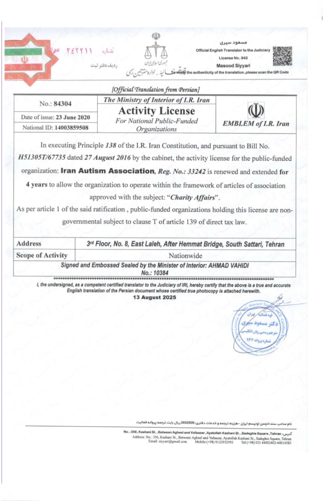 The Iran Autism Association (IAA) is a non-governmental, non-profit organization and the only nationally recognized autism association in Iran, officially licensed by both the Ministry of Interior and the Ministry of Health. With 23 regional offices across the country and consultative status at the United Nations (ECOSOC), the Association serves as a leading voice for individuals on the autism spectrum and their families.